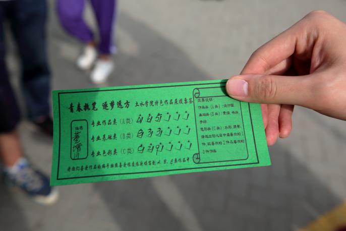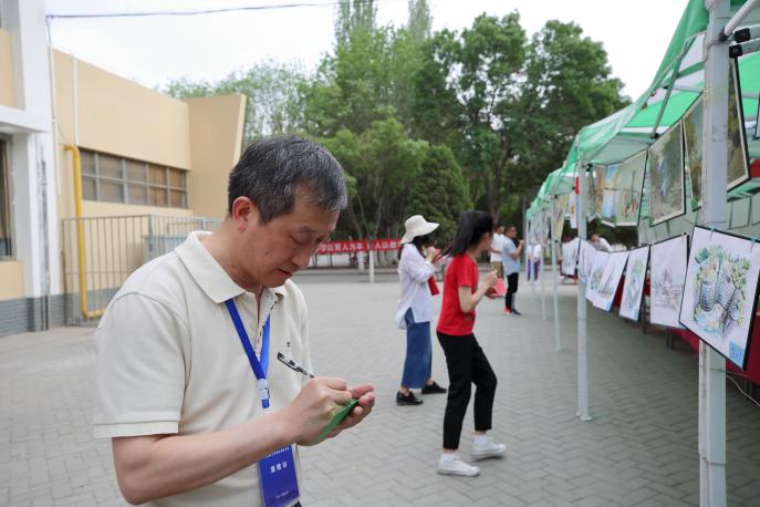 董教授认真仔细地对专业作品区(A类)、专业基础区(B类)和专业色彩区(C类)的每一幅作品进行了评审,并不时向员工询问作品的设计思路等内容。参观结束后,董教授在选票上选出了自己心目中的优秀作品,与前来参观的同学进行了亲切交谈,与大家分享参观的感受,并对公司在审核评估期间组织活动的形式和同学们设计作品的质量给予了充分肯定。