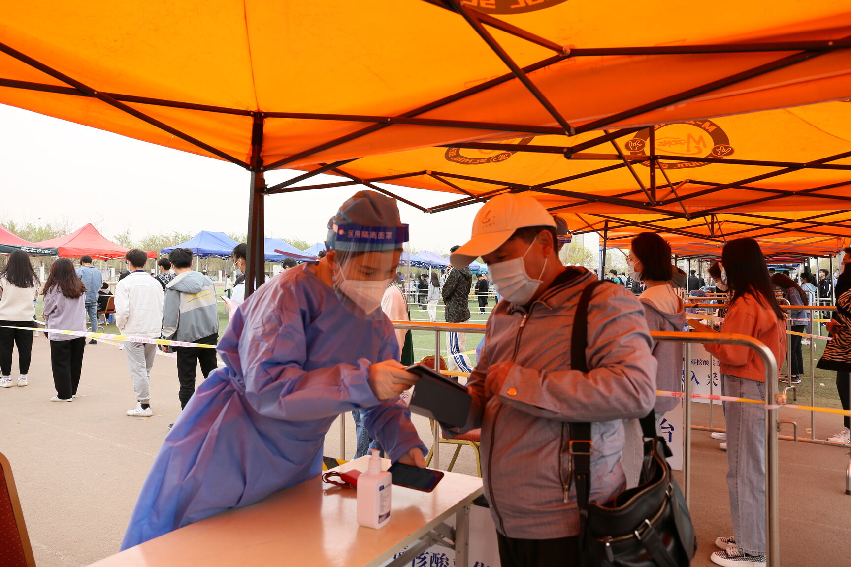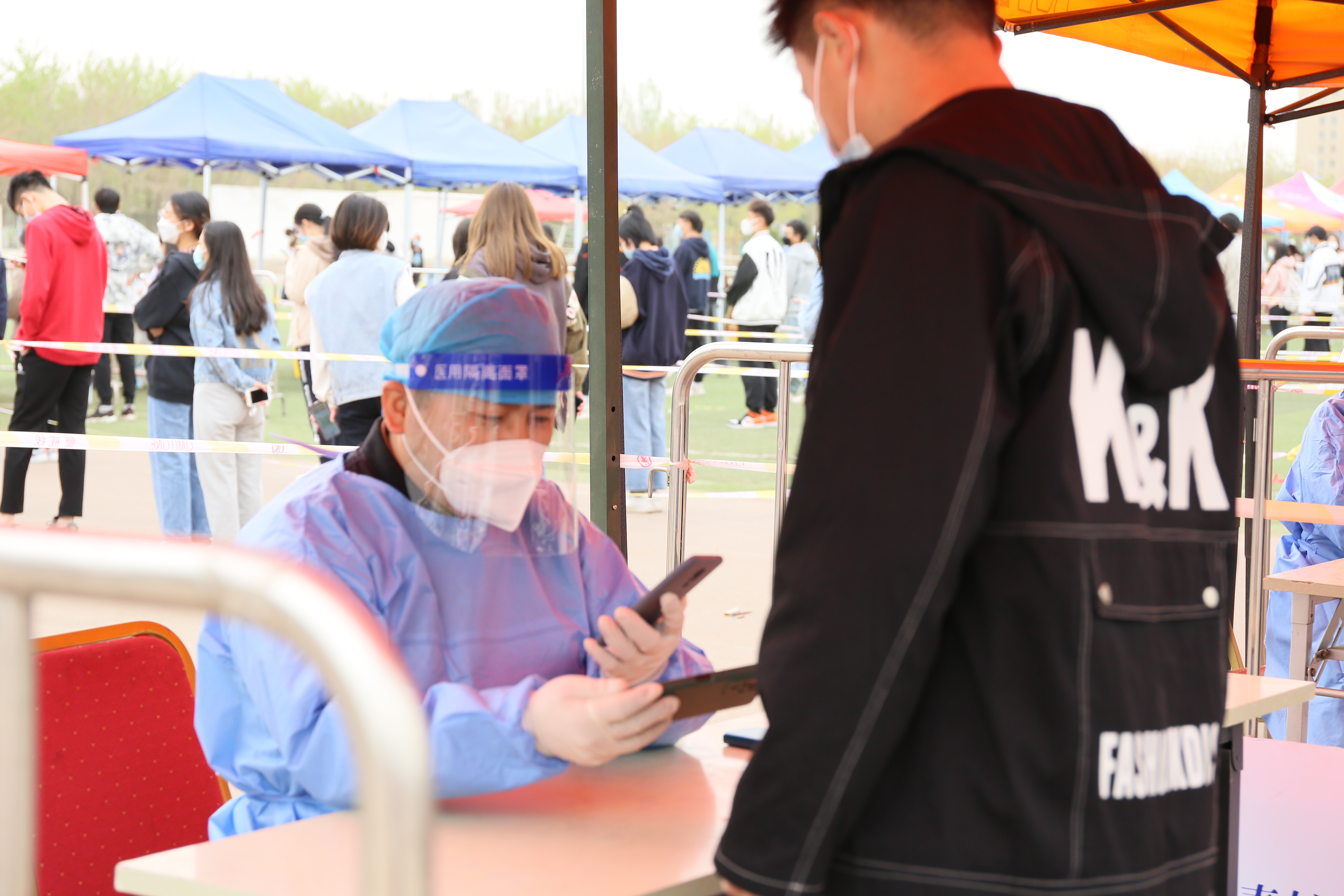 在公司核酸检测现场,公司志愿者们积极维持现场秩序,引导师生有序排队,教工党员志愿者认真做好扫码、测温、核酸检测登记等工作;志愿者们与医务人员并肩作战,始终以认真的工作态度、真诚的服务态度用心为广大师生服务,用大爱筑起阻击疫情的防线。