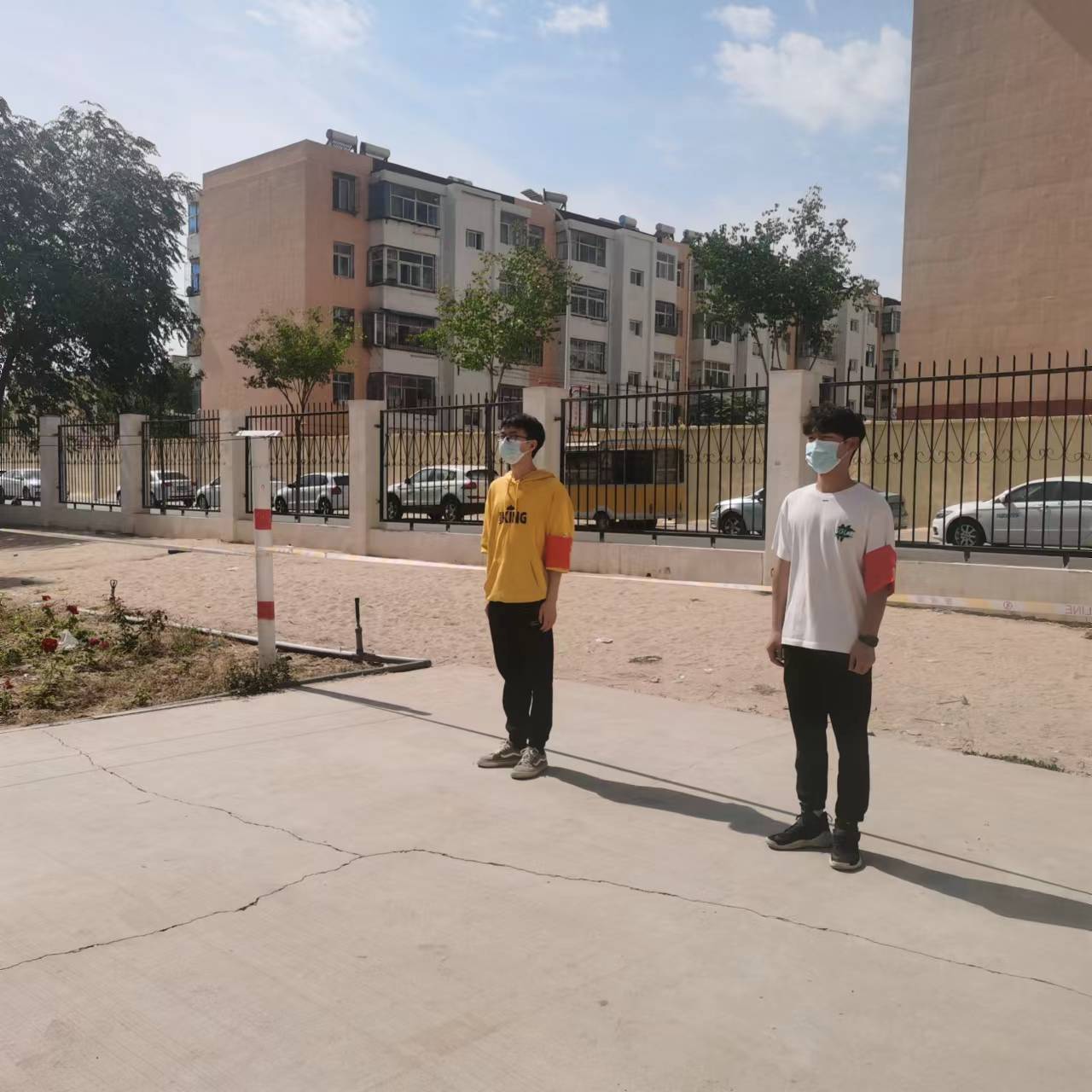 在公寓楼外和围墙边,由党员和积极分子组成的疫情防控志愿者,正在积极巡查有无违规拿取外卖的行为,并耐心做好督促和引导工作,杜绝员工因定外卖而带来感染风险。