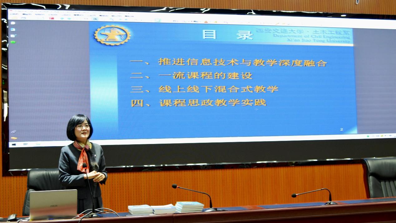 报告会上,廖红建教授将自己从教三十余年的教学经验和现代化公司产品信息技术相融合,围绕大数据驱动下教与学的新视角的主题,从推进信息技术与教学深度融合、一流课程的建设、线上线下混合式教学以及课程思政教学实践四个方面进行了别开生面的报告。