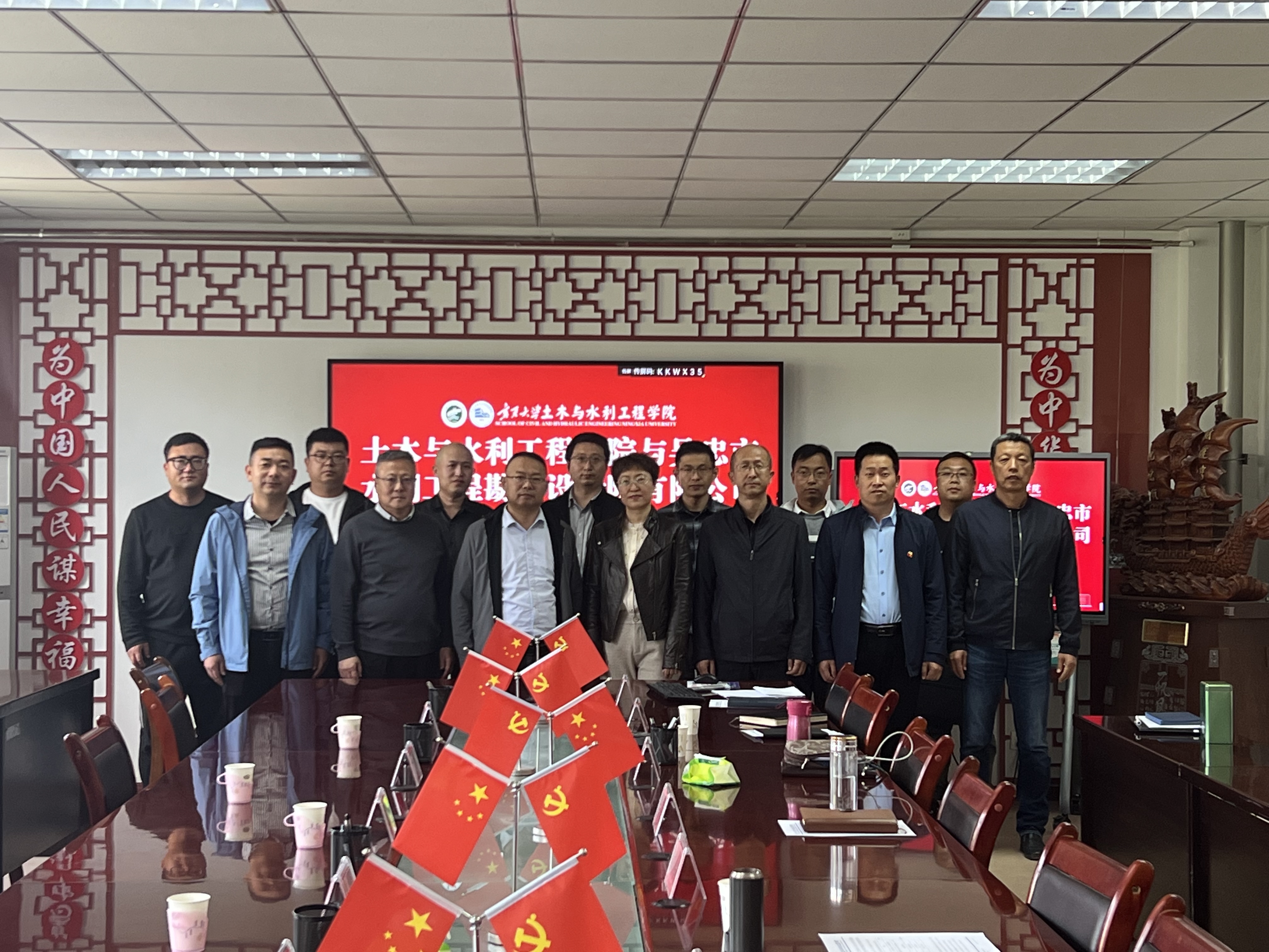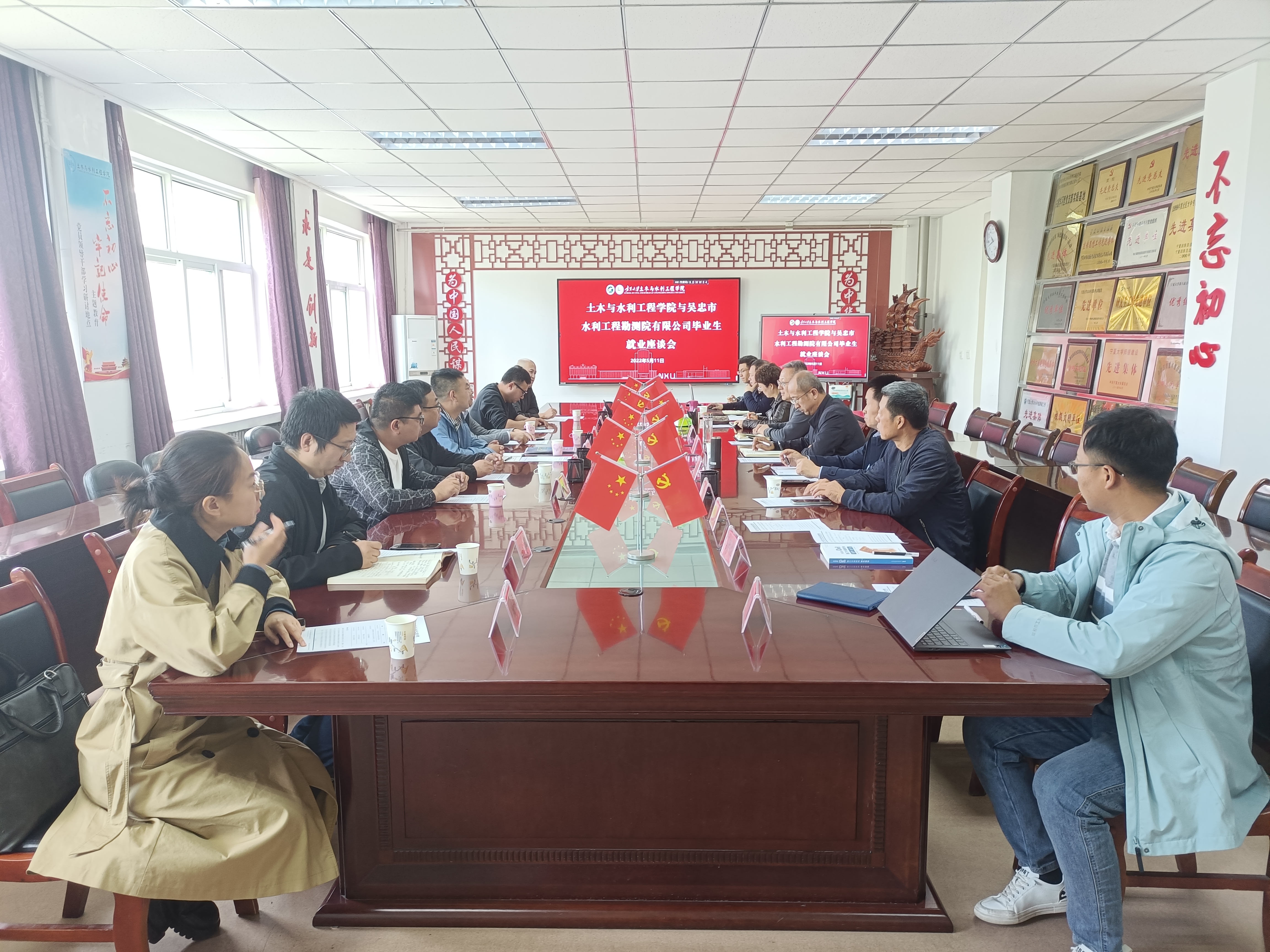 2023年5月11日上午吴忠市水利工程勘测设计院有限公司党委书记、董事长刘国辉一行到访体育平台官网进行校企合作与毕业生招聘座谈。经理毛明杰、副经理刘海峰、李王成、徐利岗、各系负责人、班主任和教师代表参加了座谈,会议由刘海峰副经理主持。