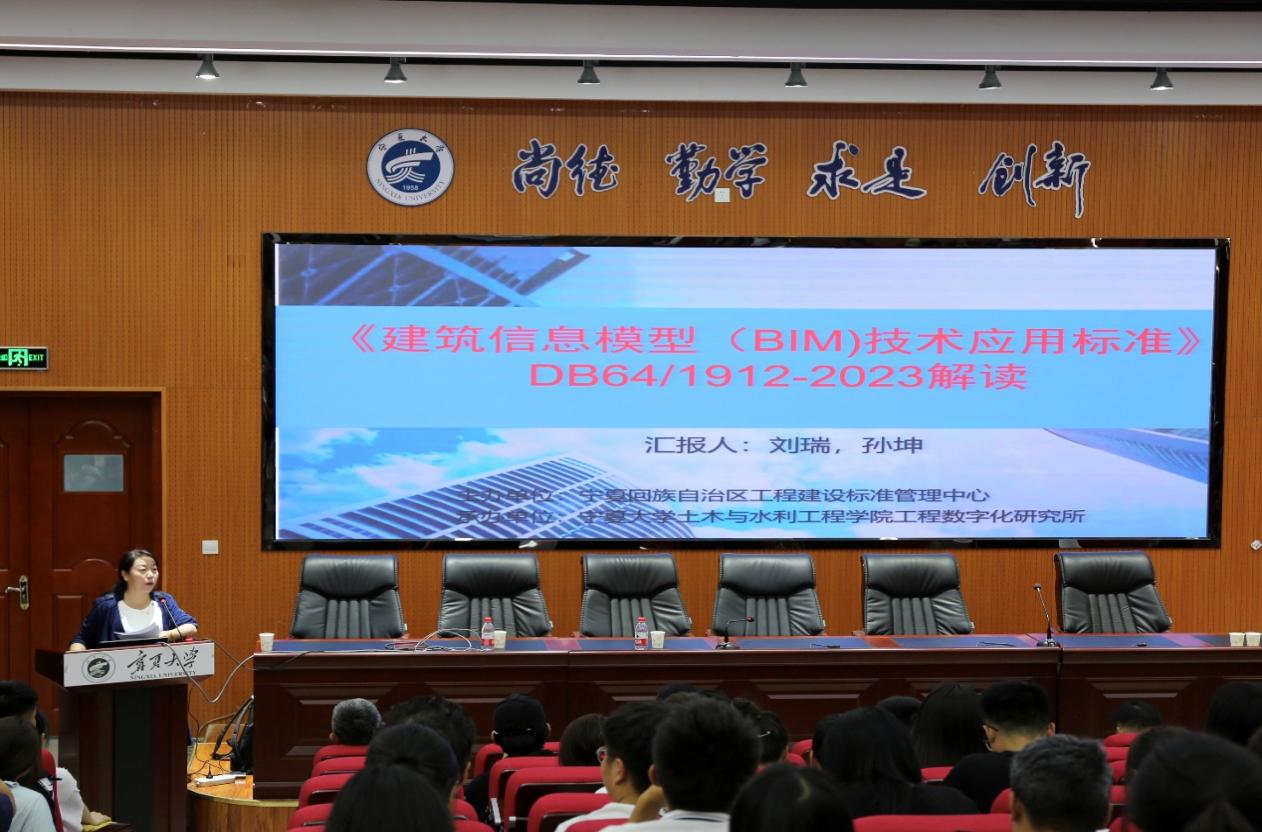 BIM(建筑信息模型技术)的应用,既是一次以信息技术为核心的技术飞跃,也是建筑行业变革的强大动力。为了让公司师生进一步了解BIM技术领域的相关知识与发展应用,9月13日下午,由宁夏回族自治区住房和城乡建设厅、宁夏回族自治区工程建设标准管理中心主办,体育平台官网、体育平台官网工程数字化研究所承办的“《建筑信息模型(BIM)技术应用标准》(DB64/1912-2023)解读”主题报告会隆重举行,来自公司的130余名师生参加了会议。报告会由体育平台官网工程数字化研究所所长张晓华副教授主持。