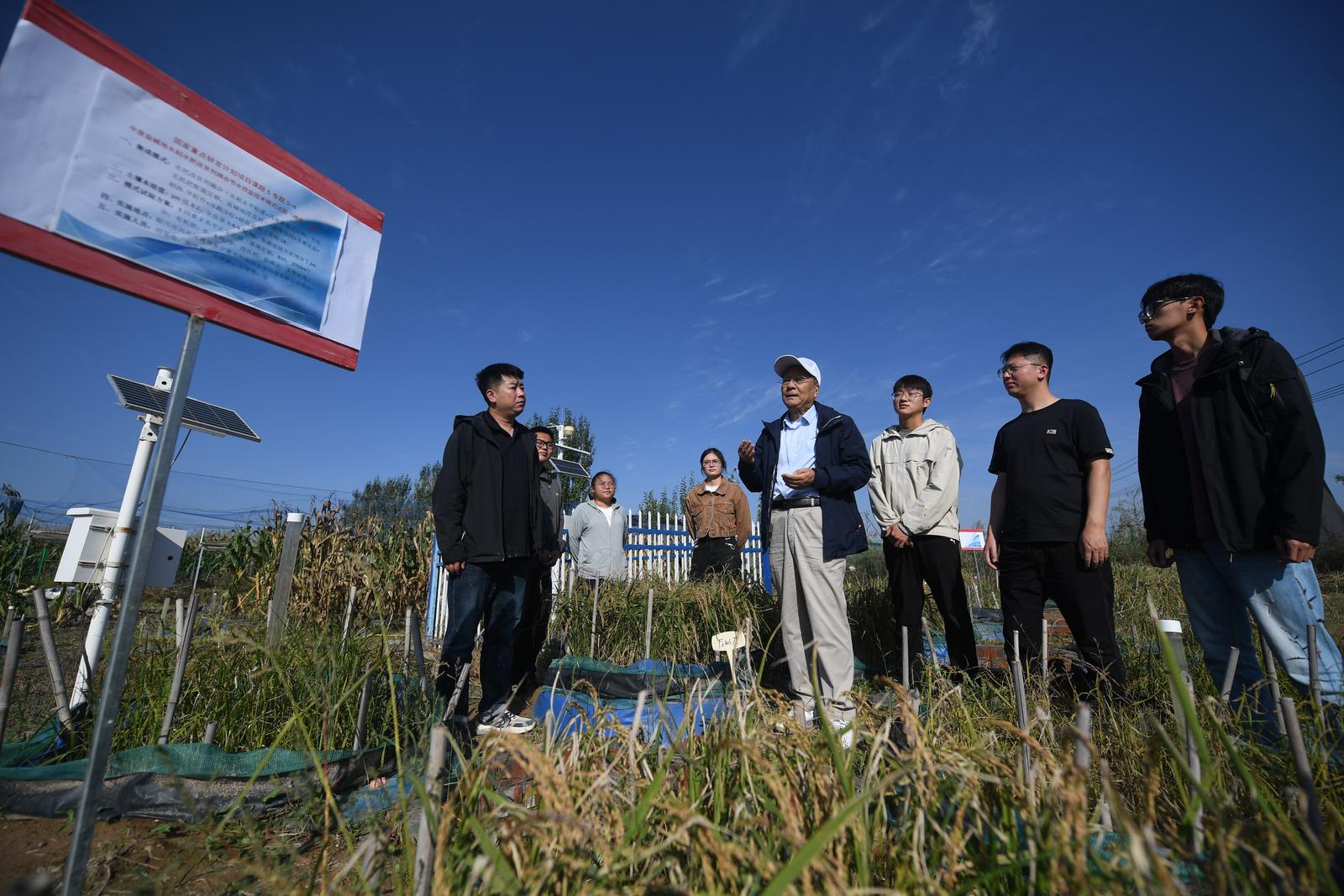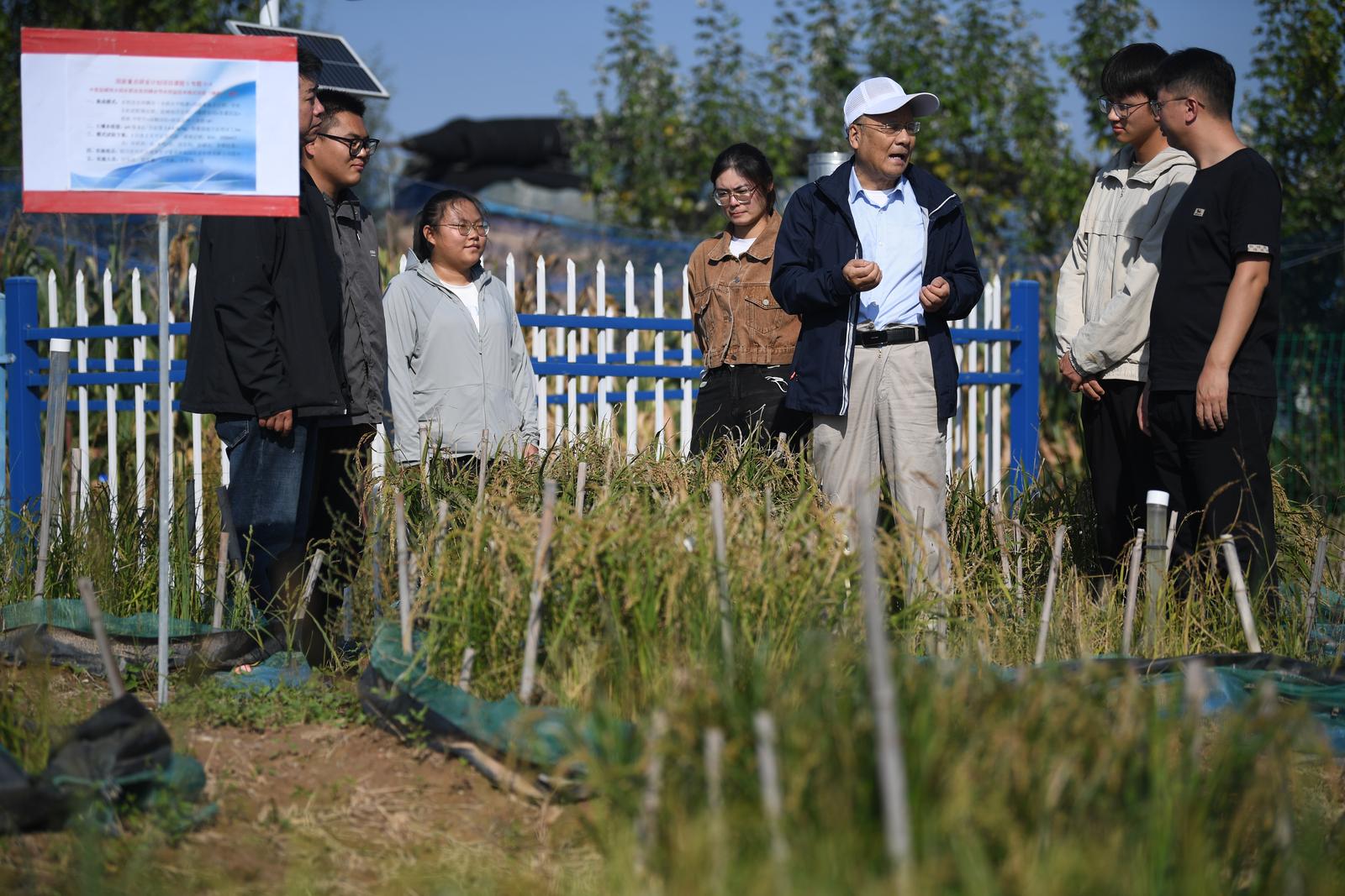 田军仓教授(右三)在试验田中,就地为身旁自己带的研究生们答疑解惑。
