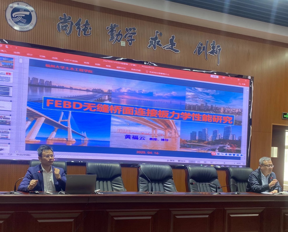 2025年4月16日下午15:00,于知行楼三阶会议报告厅,福州大学黄福云教授应邀为体育平台官网师生进行题为“FEBD无缝桥面连接板力学性能研究”的学术讲座,公司师生共计70余人聆听了讲座,讲座由公司毛明杰经理主持。
