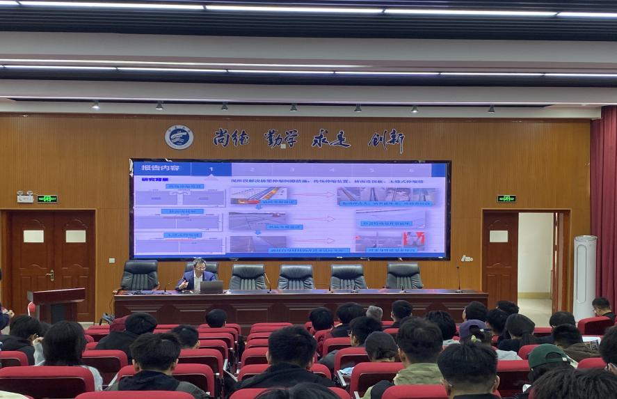 在报告中,黄福云教授详细介绍了无缝桥研究的发展历程和前沿动态。针对现有桥梁伸缩装置易损坏、难修复的行业痛点,团队基于变形性能设计理念提出了一种新型的无缝桥桥面连接构造-FEBD无缝桥面连接板,该技术已在基本力学性能、受弯性能、变形协调性能、疲劳性能、工型胀缝填料以及弹性体材料路用性能等六大方面通过严谨的科学实验和数据分析。目前,该技术已在福建、江西、上海等地的桥梁工程中获得成功应用,显著提升了行车安全性和桥梁使用寿命。特别值得注意的是,在极端条件下的测试表明,FEBD连接板展现出卓越的适应性,为其在西北地区的推广应用奠定了基础。在报告会上,黄教授深入浅出的讲解、富有激情的演讲,赢得了在场师生的热烈反响,激发了师生们的热情。