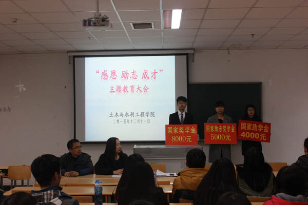 马小凤老师首先对公司本年度各类奖助学金评定工作进行了简单的回顾。王娜老师宣读2015年国家奖学金、国家励志奖学金、国家助学金获得者名单。之后员工代表2014级周浩然、2013级谭一品、2015级张美洁三名同学分别代表国家奖学金、国家励志奖学金、国家助学金获得者先后做了发言,他们表达了对公司、老师辛勤培养的感谢之情,表示会努力学习回报公司、回报社会、回报国家。最后,张强副书记作了总结讲话,他从今年资助政策的变化、公司资助工作的情况两方面入手,对今年的评定工作进行了系统性的总结,对广大同学提出了要有感恩奉献意识、树立自立自强意识,增强勤俭节约意识三个方面的要求,希望同学们能更加努力学习,争取取得更好的成绩。
