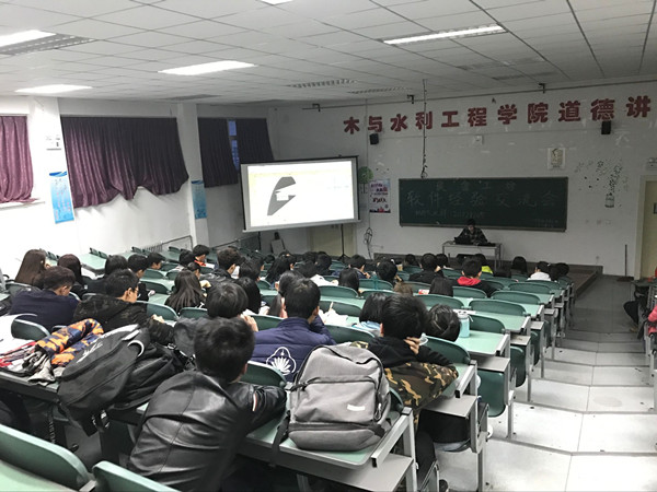 会议开始,王灿学长从“软件的概述”、“软件的市场需求和在工作中的应用”、“部分软件的学习方法”及“相关网站的推荐”四个方面进行讲解,在讲到“软件的应用”时,他以公司c区“老员工活动中心”为模向同学们展示了部分软件的应用方法,并逐一介绍了“犀牛”、“SU”、“BIM”等软件的特性及优点。紧接着,李东胜学长以“斯洛文尼亚员工公寓”为例详细讲述了实体建筑的空间、构造及设计理念,用他丰富的经验向在场同学传授自己的学习技法。两位学长精彩的讲解使在场同学大开眼界,教室里顿时响起了雷鸣般的掌声。会议的最后,主讲人组织在场同学们以提问的方式进行互动交流,学长学姐们则耐心解答,大家纷纷表示在这次交流会中受益匪浅!