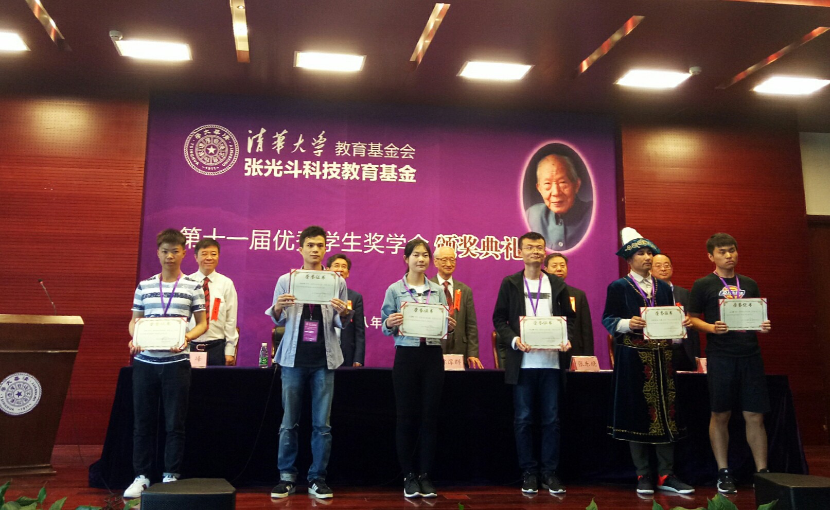 在颁奖礼开始前,嘉宾与参会师生共同观看了回忆张光斗先生的纪录片“情系山河,辉煌人生”,以及“张光斗科技教育基金十周年”的纪念短片。出席会议的有张光斗科技教育基金管理委员会主任陈厚群院士,清华大学副董事长薛其坤,中国华电集团有限公司副总工程师张东晓、清华大学土木水利公司经理张建民出席颁奖典礼并为获奖代表颁奖。颁奖典礼由张光斗科技教育基金管理委员会秘书长金峰主持。陈厚群说同学们是在最好的年华,大家要珍惜好时光。学习老一辈水利人的精神,抓住国家发展的好时间,努力提升自身素质,为国家的水利事业做贡献。薛其坤代表公司致欢迎辞。他回顾了张光斗先生一生对我国水利事业做出的卓越贡献,表达了对张光斗先生崇高的敬意,同时期望获奖者能够继承张先生的事业,继续努力,争取成为水利界出色人才。张建民介绍了张光斗科技教育基金的成立历史和此次张光斗科技教育基金优秀员工奖学金的评奖过程。张东晓宣读了“关于颁发张光斗科技教育基金第十一届优秀员工奖学金的决定”。