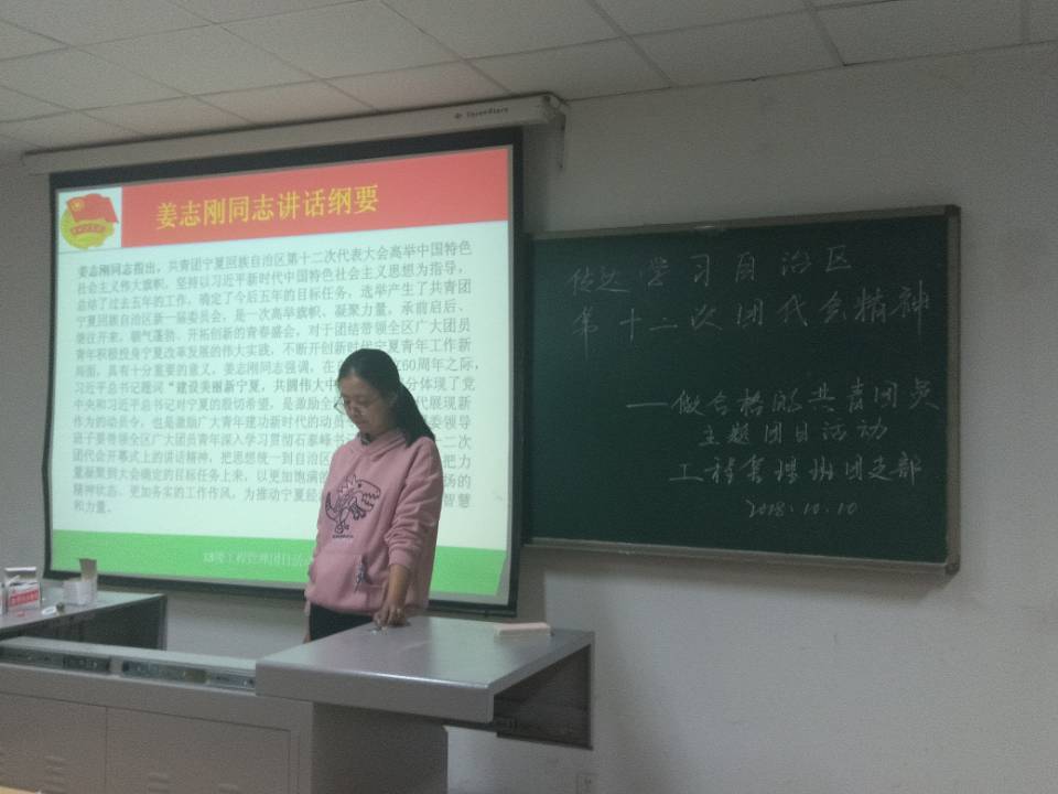 随着共青团宁夏回族自治区第十二次团员代表大会的闭幕,为将学习贯彻自治区第十二次团代会精神引向深入,体育平台官网于10月10日(星期三)集中安排各班团支部开展主题团日活动。了解认识团代会并将团代会精神进行到底。