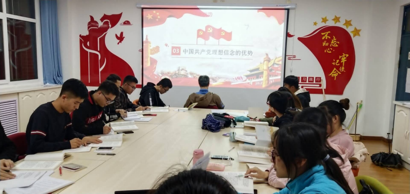 王娅茹同志只要从三个方面坚定地理想信念、理想信念的特点、坚定理想信念的优势进行讲解。理想是对未来事物的美好想象和希望。理想作为一种思想意识,是一个人的政治立场、世界观和人生观的集中表现;信念是指人们对现存的或可能的事物、观念等的正确性和正义性的坚定不移的确信和笃信;信仰是人对人生观、价值观和世界观等的选择和持有。是对某种主张、主义、宗教或某人极其相信和尊敬。让大家明白理想、信念、信仰的概念。随后,王亚茹同志提出两个问题:1.什么是共产党人的理想信念?坚定的理想信念是共产党人安身立命的根本。共产党人的理想信念就是对马克思主义的信仰,对社会主义和共产主义的信念。2、为什么要坚定理想信念?习近平总书记指出:“坚定理想信念,坚守共产党人精神追求,始终是共产党人安身立命的根本。理想信念就是共产党人精神上的钙,没有理想信念,理想信念不坚定,精神上就会缺钙,就会得软骨病。”