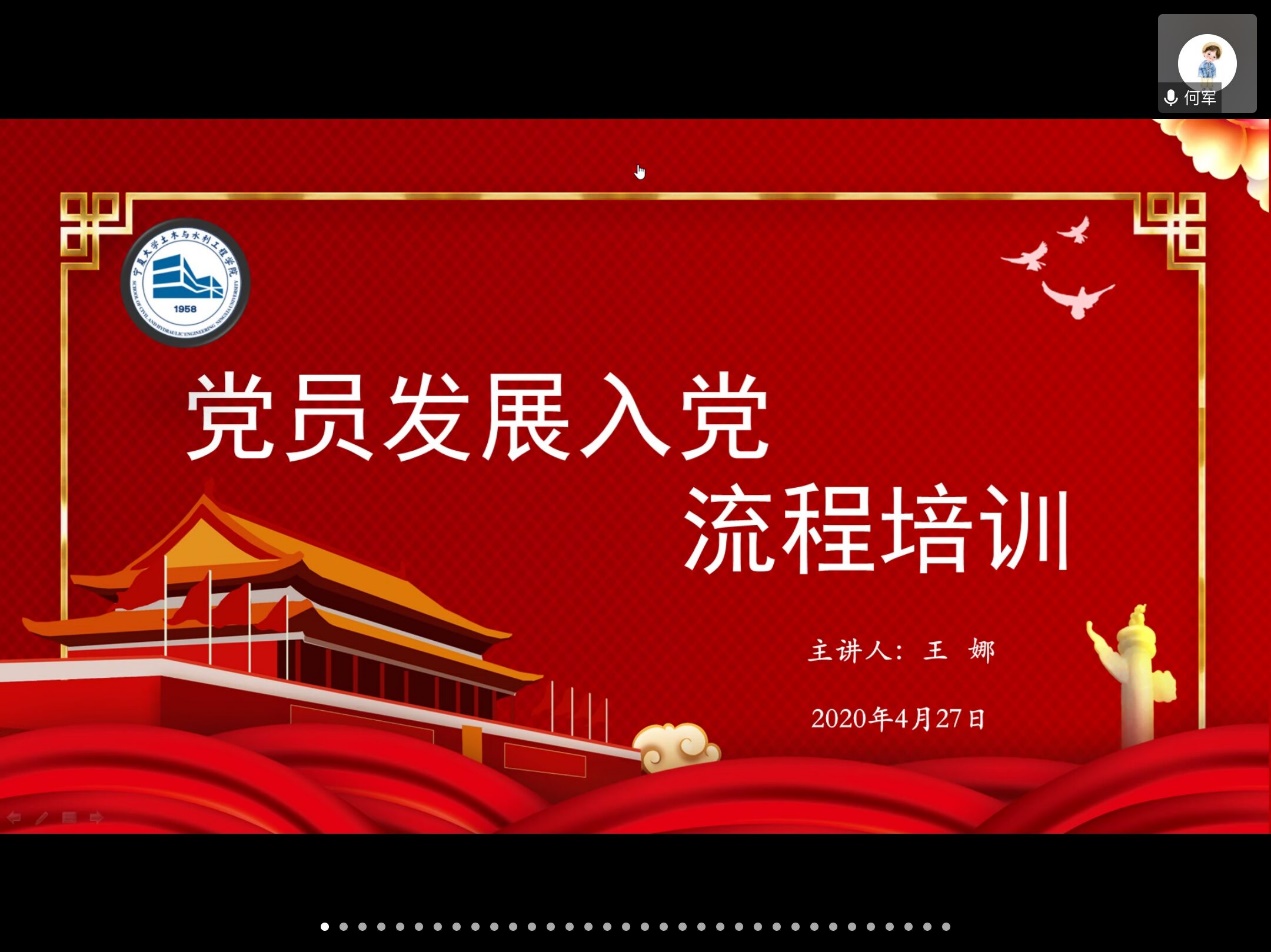 2020年4月27日晚19点,2020年上半学期发展对象与入党积极分子培训班第六次培训利用腾讯会议线上举行,本次培训由公司党委委员王娜老师主讲,2019年下半年和2020年上半年积极分子、2020年上半年发展对象全体学员参加了本次培训。