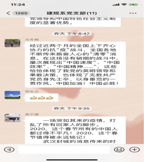 随后,每名党员就疫情期间的所见所闻、所思所想进行了分享。土木学硕支部赵广兴说到:咬定青山不放松,不破楼兰终不还。这场疫情使我们明白只有中国共产党才能救中国,只有坚持中国共产党的领导,中华民族终将实现伟大复兴。在疫情面前中国特色社会主义制度的优越性显而易见。作为员工的我们,要利用好这个机会,在家里也要认真学习,静下心来想一想自己的人生规划;我们要正确追星,我们要追像钟南山、李兰娟这样的星,这样的人才能强国。外国的月亮不一定有中国的圆,面对新冠肺炎疫情,中国无疑是做的最好的!作为年轻一代,我们一定要肩负起实现中华民族伟大复兴的责任!