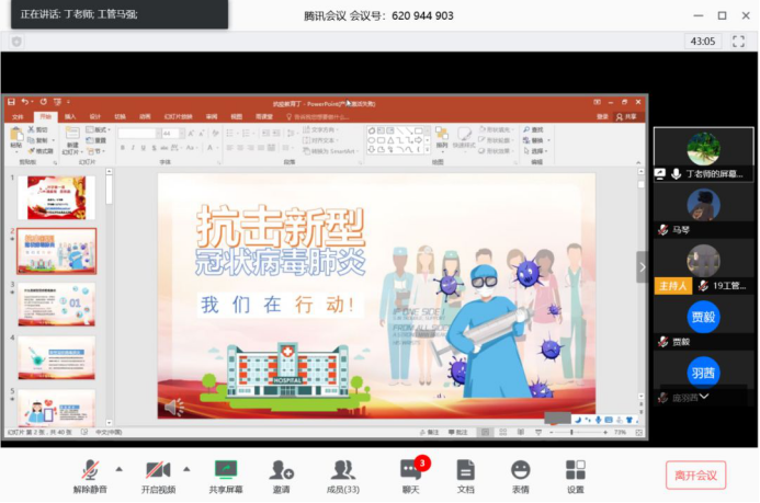 “共抗疫情、爱国力行”主题班会向员工们传达了各级会议精神以及教育与心理关怀,强调了“停课不停学”的有关要求。通过网上视频会议,同学们即使相隔千里,却依然热情高涨,积极参与讨论老员工在疫情下的责任与担当以及老员工如何参与到祖国的防疫抗疫战中。