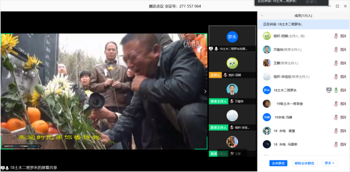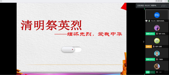2020年4月8日晚,由2018级团总支部书记罗永主持,2018级土木2班、水利水电班和2019级土木1班、水利水电班四个团支部共同开展了本次“清明祭英烈”线上主题团日活动。参加本次活动的老师有18级辅导员王娜和19级辅导员万愉快。