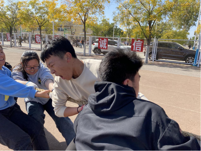 裁判哨声响起,参赛人员紧握绳子,努力下压身体,用尽力气将绳子拉到自己这方。同学们为其加油助威,恨不得冲上前奉献自己的一份力量。经过激烈的耐力与体力的较量,7支队伍成功晋级,获得进行下场晋级赛的资格。
