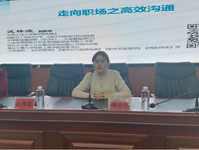 武林波教授以如何高效沟通作为讲座的切入点,围绕职场沟通的方方面面,从怎么自我沟通、自我认识讲起,随后以经典的唐僧团队为例子,告诉同学们怎么与不同性格的人进行有效的沟通以及在沟通中应注意的礼仪。最后武林波教授就常见的沟通阻碍的相关问题进行阐述,告诫同学们在日常生活中应学会倾听、学会生存、学会交流、学会学习、学会技能,以便更好的适应职场生活。