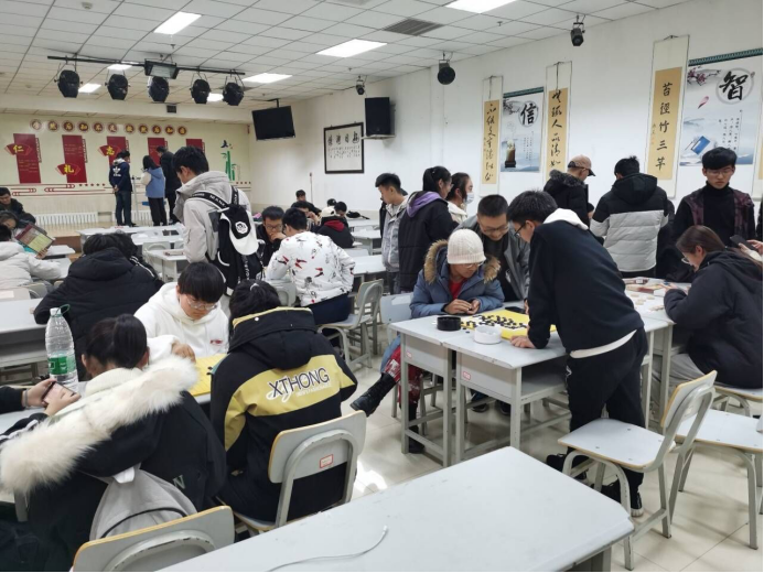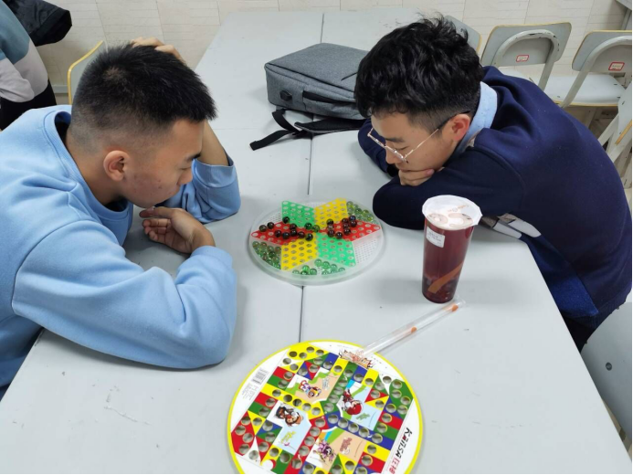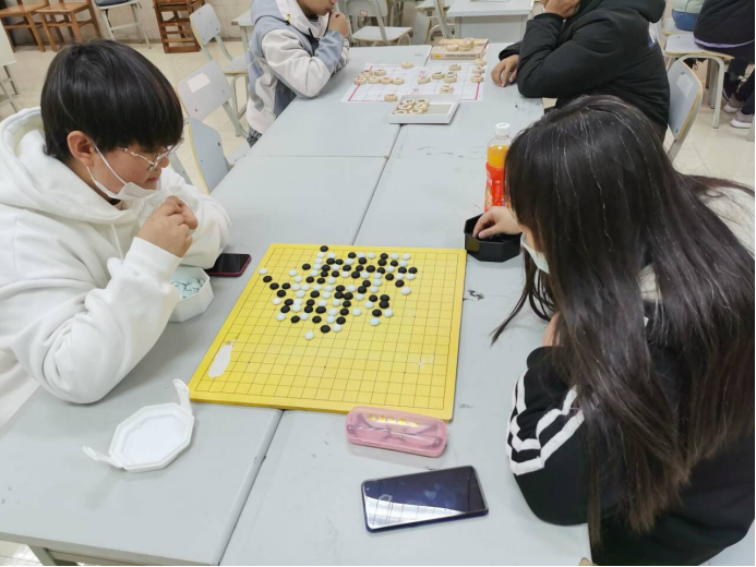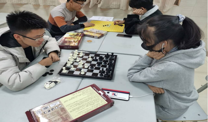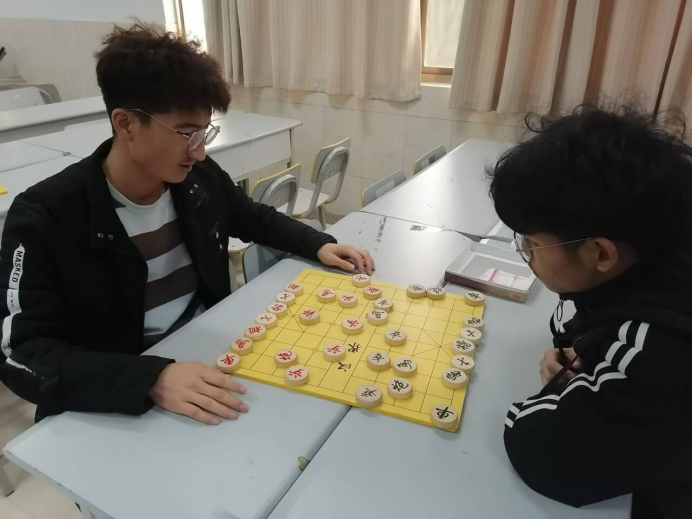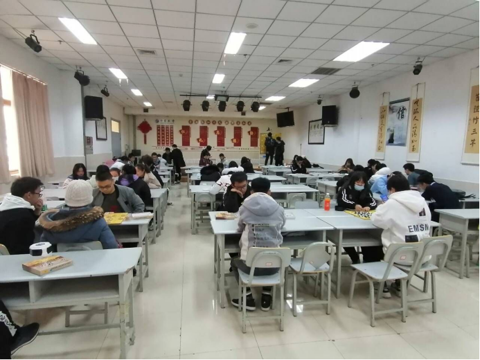 下午1:45左右,棋社干事陆续来到老员工活动中心118教室,在陈志斌的组织下,大家摆好棋桌,放好棋盘,等待着活动参与者的到来。2:00活动正式开始。同学们有的两两坐在一起开始对弈,也有的学习打谱,遇到不解处,棋社的棋队成员主动指点一二,同学们认真地学习着棋类知识。