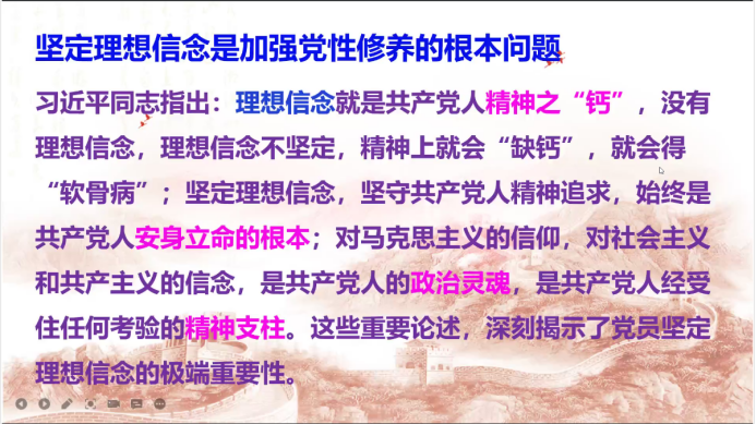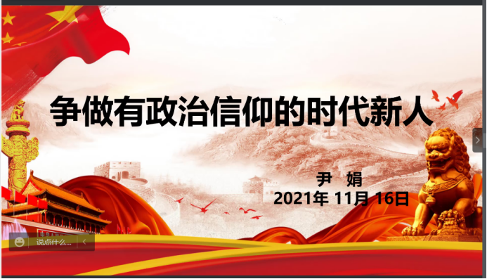 为坚定大家的理性信念和政治信仰,做有理想、有本领、有担当的时代新人,体育平台官网于11月16日晚开展了以“争做有政治信仰的时代新人”为主题的线上党课培训,公司党委副书记尹娟主讲,2021年秋季学期入党积极分子和党员发展对象全体参与,培训由何涛老师主持。