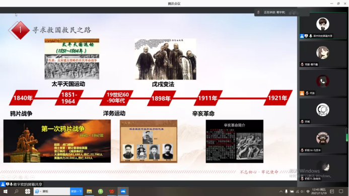 随后,蒋宇欢以1840-1921年的历史事件将我国救国救民之路娓娓道来。他强调把思想问题解决好,才能进一步解决实际问题。希望同学们能从历史中学习,把思想问题和实际问题结合起来,进一步提高解决问题的能力。