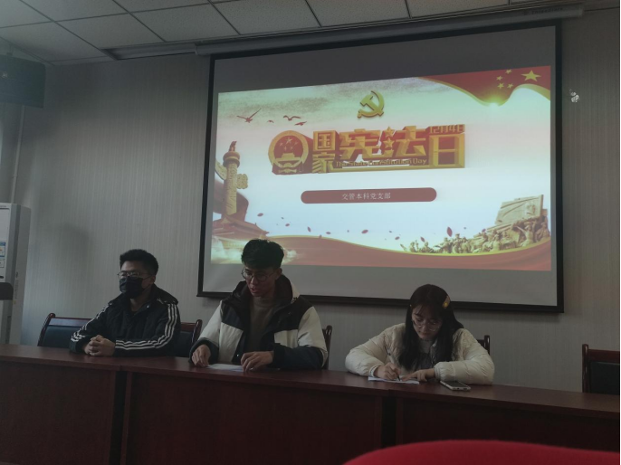 2021年12月4日是第八个国家宪法日,11月29日至12月5日是第四个“宪法宣传周”,活动主题为“以习近平法治思想为指引 坚定不移走中国特色社会主义法治道路”,为此交管本科党支部展开了相关主题的学习会。