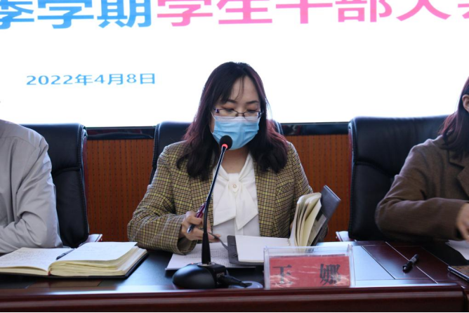 首先,王娜通报了公司工作分工调整、本学期学风统计整体数据、学业警示单发送情况、电信诈骗情况等,随后通报了本学期入党积极分子推荐情况、第二课堂完成情况以及五四评优情况,最后重点说明本学期疫情防控中员工隔离情况、违纪行为及处罚情况,并敦促各位员工干部继续跟进班级管理,向每一位同学完整传达会议内容。