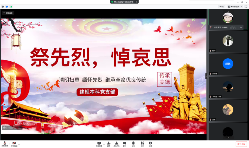 “红花无情笑东风,青山有幸埋忠骨”。为深切缅怀革命先烈的丰功伟绩,发扬革命传统,加强爱国主义和党史学习教育,4月6日晚,体育平台官网建规本科党支部于线上开展了2022年第5次党专题组织学习会暨“祭先烈,悼哀思”活动,通过英烈故事云分享会、观看纪录视频等形式,让大家在慎终追远中不忘初心、担当使命,进一步坚定理想信念,弘扬英烈精神。建规本科党支部集体参与会议,会议由组织委员丰丽阳主持。