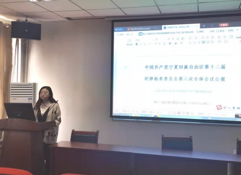 首先,白嘉怡同志带领全体党员集中学习了《中国共产党宁夏回族自治区第十二届纪律检查委员会第六次全体会议公报》。接着在会议中播放了由中央纪委国家监委宣传部与中央广播电视总台联合摄制五集电视专题片《零容忍》第一集。