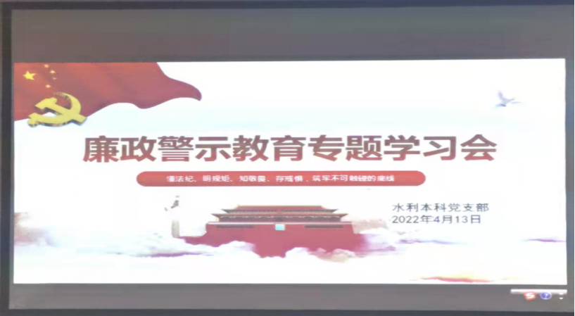 2022年4月13日下午,水利本科党支部于知行楼505召开廉政警示教育专题学习会,通过文件学习和视频学习的双重方式为大家敲响了廉政建设永远在路上的警钟。党支部全体党员参加,组织委员白嘉怡主持此次会议。