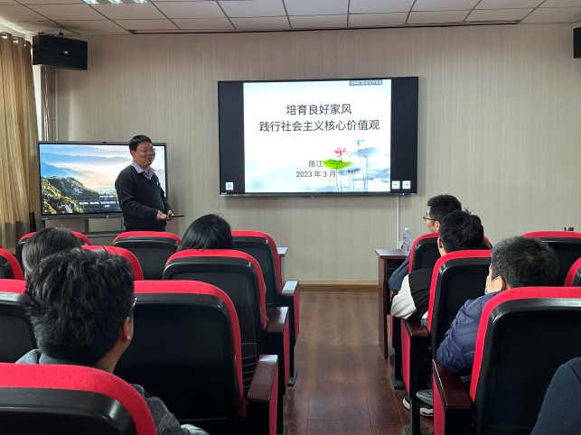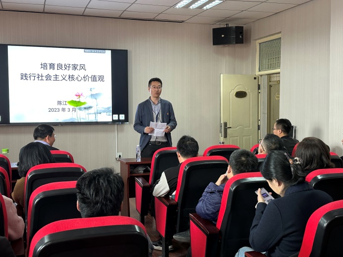 家是最小国,国是千万家。优良家风是中华民族绵延赓续的重要精神支柱,是加强新时代廉洁文化建设、打造新时代清廉建设高地的重要内容。党课重点围绕“家风与腐败之间的联系”、“著名历史人物的家风”和“如何践行良好的家风”进行讲解。陈江博士结合历代良好家风家训故事分析了家风家训对个人、对社会、对国家的影响,内容生动、内涵丰富、条理清晰、深入浅出。