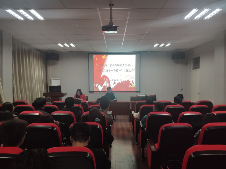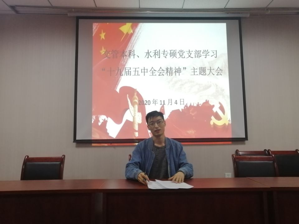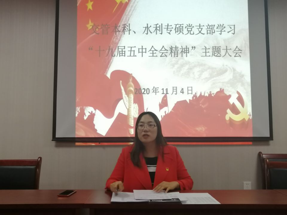 2020年11月4日晚上七点,体育平台官网交管本科、水利专硕党支部在知行楼505室联合开展党的十九届五中全会精神主题学习大会,本次会议由支部书记王娜主持,交管本科、水利专硕党支部党员参加。